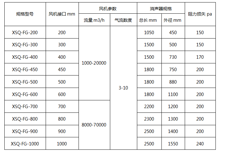 風機消聲器分圓形接口和方形接口,本表按圓形接口流量計算,用戶詢價時請報接口尺寸(方還是圓)