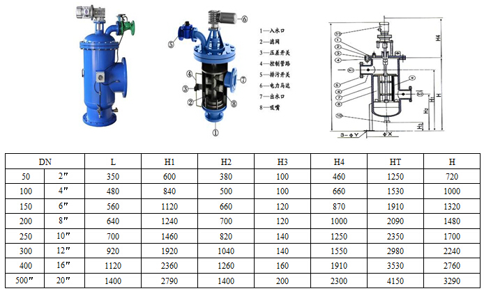 全自清洗過濾器由電機(jī)減速機(jī)、殼體、濾網(wǎng)、刮刷組合式清洗系統(tǒng)、控制箱和電動(dòng)排污閥等部件組成。