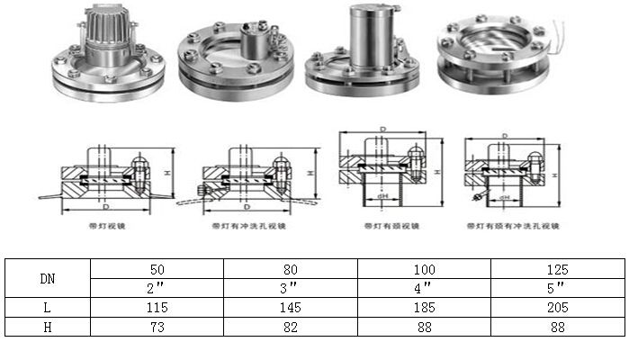 帶燈視鏡是工業(yè)管道裝置上主要附件之一,在石油、化工、醫(yī)藥、食品等工業(yè)生產(chǎn)裝置的管道中,能隨時觀察管道中液體、氣體、蒸汽等介質(zhì)流動及反應(yīng)情況,起到監(jiān)視生產(chǎn)、避免生產(chǎn)過程中事故發(fā)生的作用.帶燈視鏡一般安裝于壓力容器、真空容器、罐體、反應(yīng)器、過濾器、沸騰床等罐體和密閉容器上,在承受與容器相同壓力、溫度條件下觀察容器內(nèi)部情況,當(dāng)觀察環(huán)境昏暗時,需要配置視鏡射燈,其中分為防爆型和防腐型兩種形式。